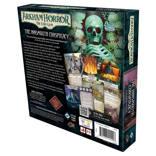 The Innsmouth Conspiracy, the sixth deluxe expansion for Arkham Horror: The Card Game, invites you to take your first steps in a twisting, time-jumping tale, starting with the campaign’s first two scenarios included in this expansion. From the heart of Innsmouth itself to the torturous coastline and beyond, these scenarios tee up an adventure that will continue to unfold across the subsequent six Mythos Packs. Far from including just two new scenarios, however, The Innsmouth Conspiracy brings five new investigators to the table with an undersea trove of player cards to support new types of decks – along with new mechanics for players to sink their teeth into, including keys, flood tokens, bless tokens, and curse tokens!