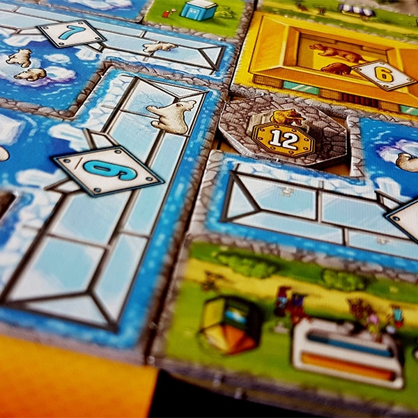 In more detail, each player in Bärenpark builds their own bear park, attempting to make it as beautiful as they can, while also using every square meter possible. The park is created by combining polyomino tiles onto a grid, with players scoring for animal houses, outdoor areas, completed construction, and more. The sooner you build it, the better! Cover icons to get new tiles and park sections. The game ends as soon as one player has finished expanding their park, then players tally their points to see who has won.