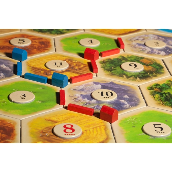 Your adventurous settlers seek to tame the remote but rich isle of Catan. Start by revealing Catan’s many harbors and regions: pastures, fields, mountains, hills, forests, and desert. The random mix creates a different board virtually every game. No two games are the same! Embark on a quest to settle the isle of Catan! Guide your settlers to victory by clever trading and cunning development. Use resource combinations- grain, wool, ore, brick, and lumber-to buy handy development cards and build roads, settlements, and cities. Acquire your resources through trades, cards, or lucky dice (even outside your turn). But beware! Someone might cut off your road or buy a monopoly. And you never know when the wily robber might steal some of your precious gains!