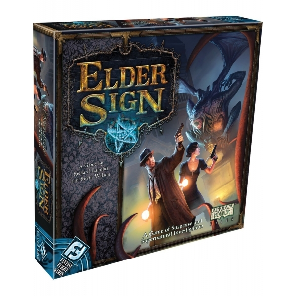 Elder Sign is a fast-paced, cooperative dice game of supernatural intrigue for one to eight players by Richard Launius and Kevin Wilson, the designers of Arkham Horror. Players take the roles of investigators racing against time to stave off the imminent return of the Ancient One. Armed with tools, allies, and occult knowledge, investigators must put their sanity and stamina to the test as they adventure to locate Elder Signs, the eldritch symbols used to seal away the Ancient Ones and win the game.