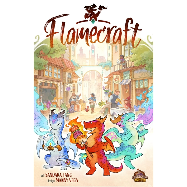 In Flamecraft, 2-5 players take on the role of Flamekeepers, gathering items, placing dragons and casting enchantments to enhance the shops of the town. Dragons are specialized (bread, meat, iron, crystal, plant and potion) and the Flamekeepers know which shops are the best home for each. Visit a shop to gain items and a favor from one of the dragons there. Gathered items can be used to enchant a shop, gaining reputation and the favors of all the dragons in the shop. If you are fortunate enough to attract fancy dragons then you will have opportunities to secure even more reputation.