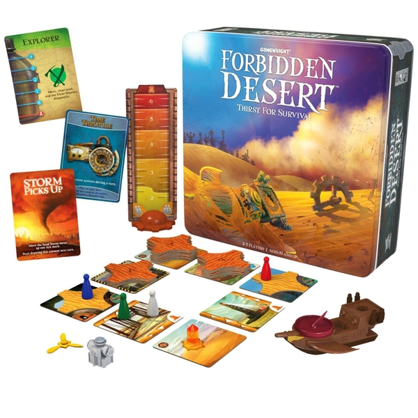 In Forbidden Desert, a thematic sequel to Forbidden Island, players take on the roles of brave adventurers who must throw caution to the wind and survive both blistering heat and blustering sand in order to recover a legendary flying machine buried under an ancient desert city. While featuring cooperative gameplay similar to Forbidden Island, Forbidden Desert is a fresh new game based around an innovative set of mechanisms, such as an ever-shifting board, individual resource management, and a unique method for locating the flying machine parts.