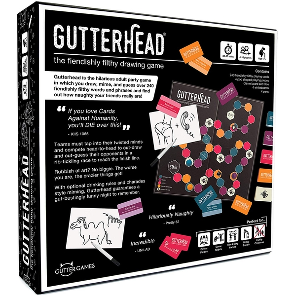Gutterhead – The Fiendishly Filthy Drawing Game. Gutterhead is the hilarious adult party game that involves drawing, miming and guessing over 240 fiendishly filthy words and phrases such as ‘Teabagging’, ‘Wet Dream’, ‘Camel Toe’ and a bunch of other stuff too outrageous to write here.