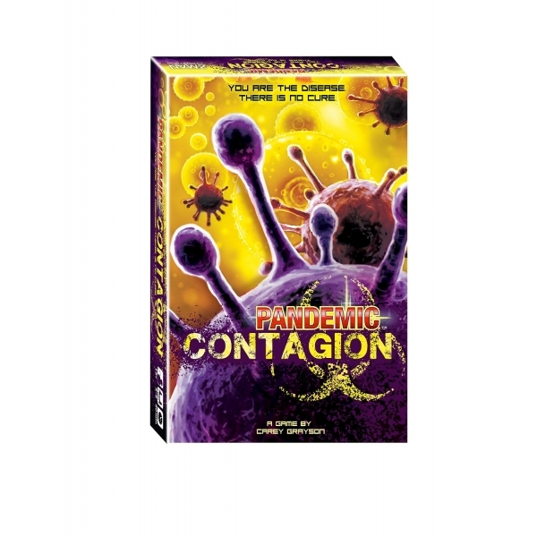 Pandemic: Contagion includes a deck of contagion cards with differing colored borders, city cards, event/WHO cards, virus cubes. On a turn you take two actions; three actions are available, and you can take the same action twice. Those actions are: