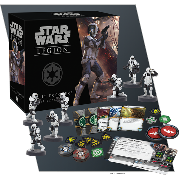 Within the Scout Troopers Unit Expansion, you’ll find a squad of seven unpainted, easily assembled Scout Trooper miniatures that can be used to field two different special forces units: a standard squad or a two-miniature strike team. Additionally, the five upgrade cards included with this expansion can be added to the Scout Troopers or another unit, giving you more options for outfitting your Star Wars: Legion armies.
