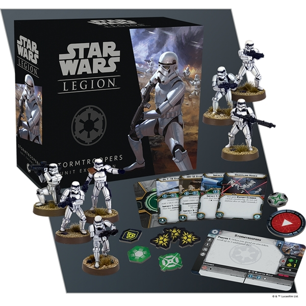 In the Stormtroopers Unit Expansion, you’ll find seven Stormtrooper miniatures, identical to the ones included in the Star Wars: Legion Core Set, along with the unit card and upgrade cards that you need to add another unit of Stormtroopers to your army.