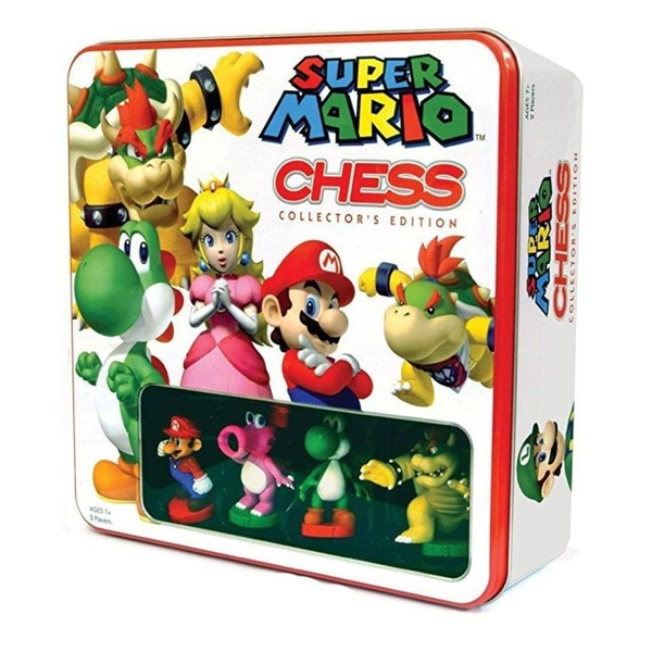 The chess board and pieces feature unique designs, taken directly from the Super Mario video game franchise. The 32 hand-painted figurines include including Mario, Luigi, Princess Peach, Yoshi, Toad, Bowser, Bowser Jr., Birdo, Goomba, and Magikoopa, and come packaged in a collectible tin!