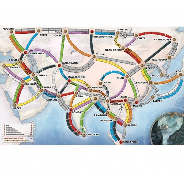 - Legendary Asia from François Valentyne – The main change in this set-up is that some of the routes through Asia are labeled mountain routes, with one or more spaces on the route bearing an X. Whenever a player claims one of these routes, she must place a train from her reserve in the Mountain Crossing area of the game board, earning two points for each such train but losing access to them for the rest of the game. The player who connects to the most cities in a single network earns a ten point “Asian Explorer” bonus.
