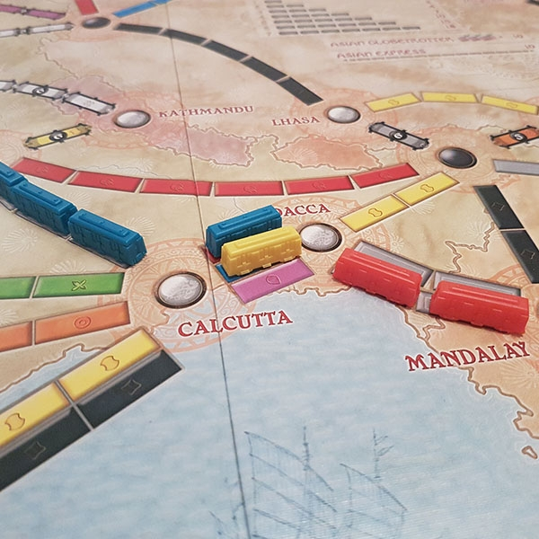 - Team Asia from Alan R. Moon – Four or six players compete as two-player teams, with teammates sitting next to one another at the table. Each player has her own secret hand of cards and tickets, in addition to some cards and tickets being placed in a shared cardholder that either player on the team can access. When a player draws cards, she must place one card in the cardholder and the other in her hand (unless she takes a face-up locomotive, in which case it must be shared); when a player draws tickets, the first ticket kept must be plac ed in the cardholder and any additional tickets kept added to her hand. A player can spend her turn to add two tickets from her hand to the cardholder. A team’s points are tracked collectively, and the team with the highest score wins.